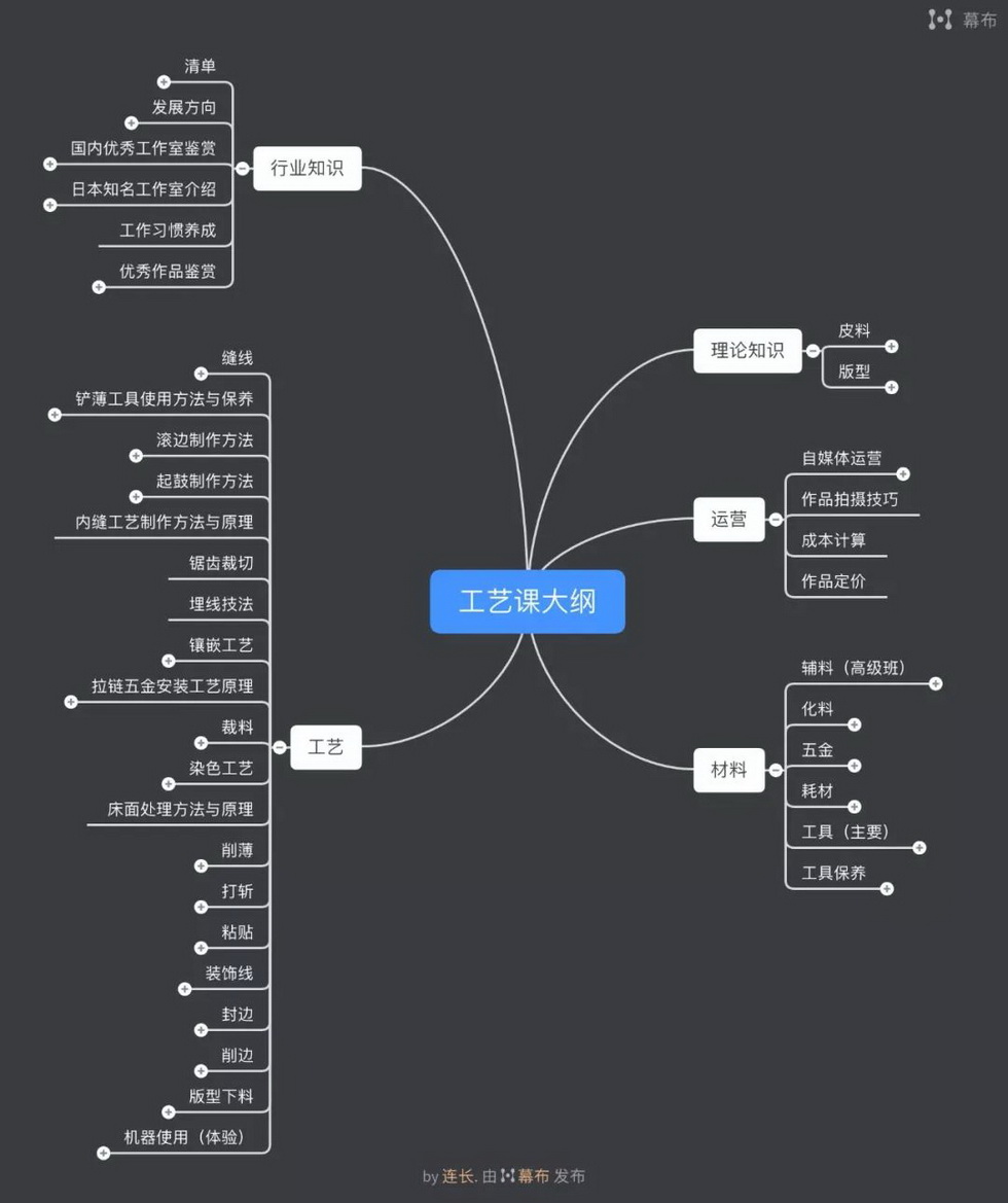 6、参考日本手工皮具培训教室:以作品为主线学习各种工艺,而不是学习单个技法;组合逻辑往往是困扰新手的问题,这就是为啥做大包被认为手艺高,但是懂得了组合逻辑就不用担心大小了,只学习工艺你就做不了复杂的作品。