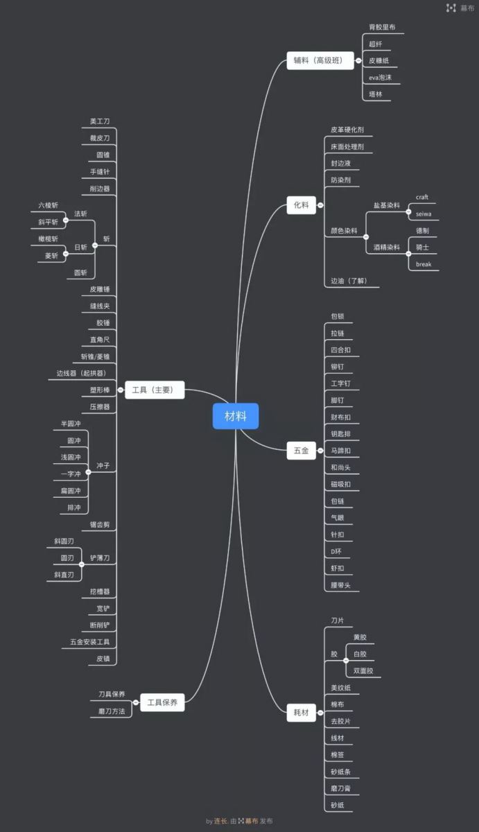 在工艺中我们通常在意工具的使用,而皮料、五金、版型、化料(封边液、床面、防染等)是新手容易忽略的,一件完整的作品是由这几部分完美的搭配才可以的,新手期你可以只关注工具和皮料,随着学习的深入,其他方面也要关注才可以。材料类的购买渠道一直是皮圈诟病的,因为老师是花了大量的资金去试错总结出来今天的采购渠道,无私的奉献给你是很难的,汐迟工坊从开班那天就把渠道共享给学员,只要我用的东西你都可以知道它在哪买的,不做中间商赚差价,而且以清单形式给你。